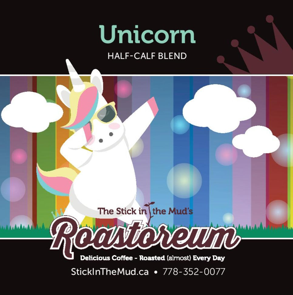 Actually, no. Developed for the rare customer seeking a half-caffeinated coffee, Unicorn is now available All The Time. We take our sweet Ripple Decaf and our delish Tsunami Espresso and we blend them suckers at a 50/50 ratio.